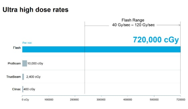 在2018年10月北美放射腫瘤學(xué)會年會上,瓦里安宣布了具有“諾貝爾獎(jiǎng)”意義的超高劑量極速癌癥治療方法——“Flash”。這將是革命性的最新粒子治療方法。Flash 療法是一種非侵入性治療,以極高的劑量及劑量率(72萬cGy/分鐘)在極短的時(shí)間里(1秒內(nèi))對人體癌癥部位釋放質(zhì)子束流。在一次照射后,癌癥細(xì)胞能就被摧毀而正常細(xì)胞損害顯著降低。目前已經(jīng)基本完成動物試驗(yàn),不久將進(jìn)入臨床試驗(yàn)階段。