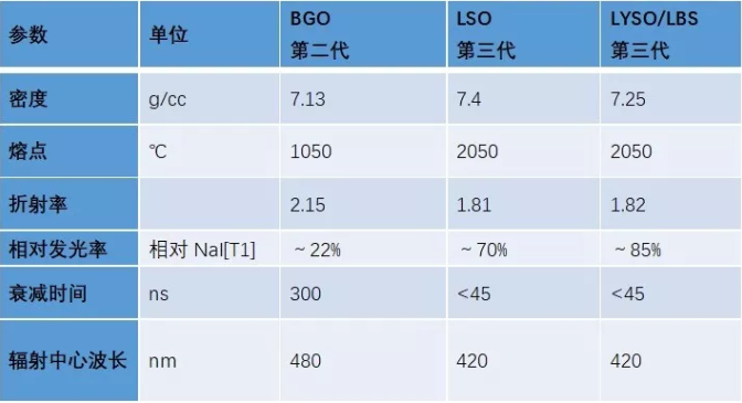 (1)晶體:從理論上講,表1所列幾種晶體均可以用于PET探測器,但是從臨床經(jīng)驗來看,目前用于PET探測器的晶體主要有BGO、LYSO、LSO和LBS等四種。其中LYSO、LSO以及LBS這類晶體由于含有金屬镥(Lutetium),因此余輝時間明顯減少。一般認為晶體余輝時間小于80ns(納秒)就可以實現(xiàn)飛行時間(Time of Flight, TOF)技術(shù)。而BGO等晶體余輝時間太長,不能實現(xiàn)TOF技術(shù),即將淘汰(1,2)。當然,含镥晶體(LSO、LYSO)也有其不足,就是含有自身本底放射性,有效原子序數(shù)偏小,會導致射線探測效率降低。所以,一般講LYSO、LSO和LBS這類晶體在PET探測器中其最佳長度為20mm左右(3)。所以,如果選擇LYSO、LSO或LBS這一類晶體,那么就必須具有TOF技術(shù)來彌補或克服其探測效率低的固有缺陷。