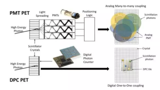 C、數(shù)字光子計數(shù)DPC(Digital photon counting)。鑒于上述SiPM的一些缺點,DPC應運而生。