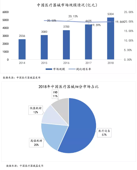 隨著國內(nèi)經(jīng)濟(jì)水平的發(fā)展,民眾支付能力的提升,人口老齡化的增加,健康需求不斷增加,中國醫(yī)療器械市場保持高速增長。2018年中國醫(yī)療器械市場規(guī)模約為5304億元,同比增長19.86%,預(yù)計(jì)未來5年將繼續(xù)保持15%以上年復(fù)合增速,遠(yuǎn)高于國內(nèi)GDP增速。醫(yī)療設(shè)備市場是中國醫(yī)療器械最大的細(xì)分市場,占比 56.80%;其次為高值醫(yī)用耗材市場,占比 19.72%,IVD占比約11%。