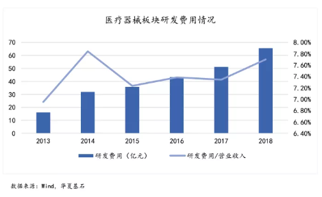 近年我國醫(yī)療器械上市公司的研發(fā)投入和人員占比持續(xù)增長,反映了醫(yī)療器械行業(yè)發(fā)展進(jìn)程對國內(nèi)企業(yè)的研發(fā)提出了越來越高的要求,行業(yè)逐步由銷售驅(qū)動(dòng),轉(zhuǎn)向研發(fā)和銷售雙輪驅(qū)動(dòng)。但總量依然不足,2018年我國所有醫(yī)療器械上市公司公司的研發(fā)投入總和為65.5億元人民幣,不及1家跨國公司投入。(美敦力在2018年研發(fā)總投入為22.53億美元)