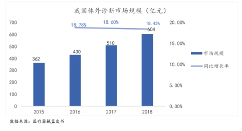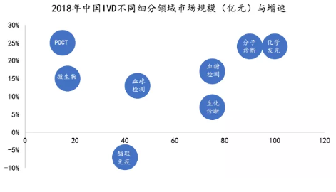 隨著IVD產(chǎn)業(yè)技術(shù)升級,中國市場IVD不同細(xì)分領(lǐng)域發(fā)展有較大差異,生化和免疫診斷中的酶聯(lián)免疫等低端產(chǎn)品增速低,而化學(xué)發(fā)光, POCT和分子診斷等高技術(shù)產(chǎn)品維持高增速。