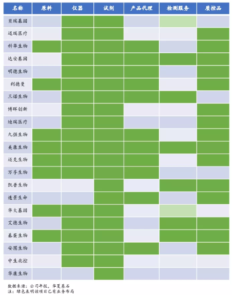 我國IVD上市公司多數(shù)由體外診斷試劑的集成創(chuàng)新和國外診斷產(chǎn)品代理起家,業(yè)務(wù)布局逐漸向原料生產(chǎn)、試劑和儀器研發(fā)、檢測服務(wù)上下游延伸。達(dá)安基因、三諾生物、美康生物和凱普生物業(yè)務(wù)生態(tài)已發(fā)展成為生產(chǎn)、研發(fā)和檢測服務(wù)全產(chǎn)業(yè)鏈綜合型方案解決商。IVD細(xì)分領(lǐng)域龍頭企業(yè)通過投資并購紛紛向產(chǎn)業(yè)鏈上下游延伸,邁瑞醫(yī)療、安圖生物、萬孚生物等逐漸攻克了上游原材料環(huán)節(jié),下游延伸“制造+服務(wù)”成為未來IVD企業(yè)發(fā)展壯大的方向。