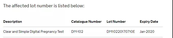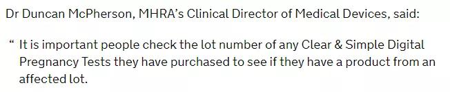 譯:MHRA醫(yī)療器械的臨床主任鄧肯·麥克弗森博士說:人們要重點(diǎn)檢查他們購買的任何清晰和簡單的數(shù)字妊娠測(cè)試的批號(hào),看看他們是否有來自受影響批號(hào)的產(chǎn)品。