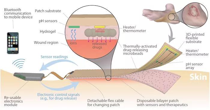 這種類型也是智能繃帶,它能通過電子元件記錄潰瘍形成、感染、氧氣、壓力、溫度、濕度、血糖水平來評估傷口的愈合進(jìn)度,幫助醫(yī)生及時(shí)做出決定。