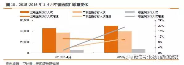 2016年1-4月一級醫(yī)院數(shù)量激增,同比2015年增長24%,而2015年同比增長9%。醫(yī)院數(shù)量不代表病人流向,但是作為標(biāo)桿數(shù)據(jù),可一定程度上表明政府的資金投入流向。而門診量則是分級診療成效的重要參考數(shù)據(jù)。