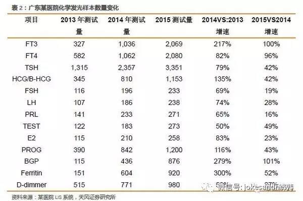 廣東省某基層醫(yī)院,一級甲等,2014年檢驗(yàn)科收入約為1000萬。2013年開始使用國產(chǎn)全自動(dòng)發(fā)光儀,開展項(xiàng)目主要為甲功、激素兩個(gè)套餐。2015-2013年樣本增量變化如下。