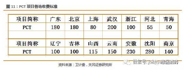 按照購買力平價(jià),PCT項(xiàng)目在中國收費(fèi)為50比較合理。最早進(jìn)口品牌進(jìn)入中國,一般先進(jìn)入經(jīng)濟(jì)相對發(fā)達(dá),人口密集的大省,因此最早的價(jià)格多在150-200之間。2014年上海的PCT價(jià)格為100,今年已經(jīng)降為80,未來依然存在降價(jià)的趨勢,并且會(huì)各個(gè)城市都會(huì)持續(xù)下調(diào)收費(fèi)。