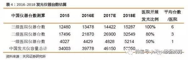 根據(jù)以上邏輯,我們大致可以測算目前的存量市場,發(fā)光還未完全滿足終端需求,2015年儀器保有量來看,只滿足了60%的需求。而未來需求端的增長依然保持極高的增速,除了進(jìn)口企業(yè),少量國產(chǎn)優(yōu)秀品牌可以分享藍(lán)海市場,儀器裝機(jī)依然有很大的空間待開發(fā)。