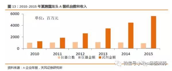 從上圖看出,A企業(yè)的試劑和儀器如果按金額計(jì)算,超出10:1,但由于以前裝機(jī)的儀器會(huì)產(chǎn)生累計(jì)疊加效應(yīng),因此不能單純相比,要根據(jù)儀器保有量測算修正。