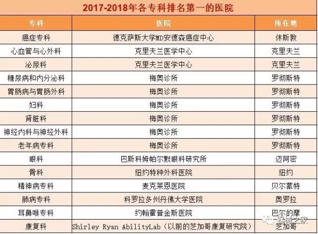 在醫(yī)療界梅奧診所就是傳說(shuō)中的麥加,世界頂尖的醫(yī)療機(jī)構(gòu)。2017年8月8日,《美國(guó)新聞與世界報(bào)道》公布了2017-2018美國(guó)最佳醫(yī)院排行榜,梅奧診所以415分的總分再次榮登榜首,并在糖尿病和內(nèi)分泌專科、胃腸科、婦科、腎臟科、神經(jīng)??坪屠夏瓴W(xué)六個(gè)??浦信琶谝?。