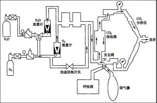 其主要有供氣裝置、蒸發(fā)器、呼吸回路、二氧化碳吸收裝置、麻醉呼吸機、麻醉廢氣清除系統(tǒng)等組成。