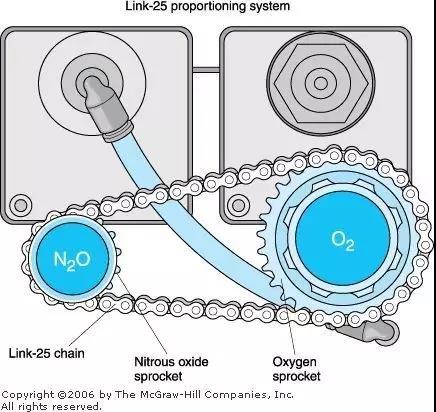 為了防止麻醉機輸出低氧性的氣體,麻醉機還有流量計聯(lián)動裝置和氧比例監(jiān)控裝置,使新鮮氣體出口輸出的最低氧濃度保持在25%左右。采用的是齒輪聯(lián)動的原理。在N?O流量計鈕上,倆齒輪之間用鏈條連接,O?旋轉(zhuǎn)一圈,N?O旋轉(zhuǎn)兩圈。當單獨旋開O?流量計針型閥時,N?O流量計保持不動;當旋開N?O流量計時,O?流量計隨之聯(lián)動;兩個流量計均打開時,逐漸關(guān)閉O?流量計,N?O流量計也隨之聯(lián)動下降。