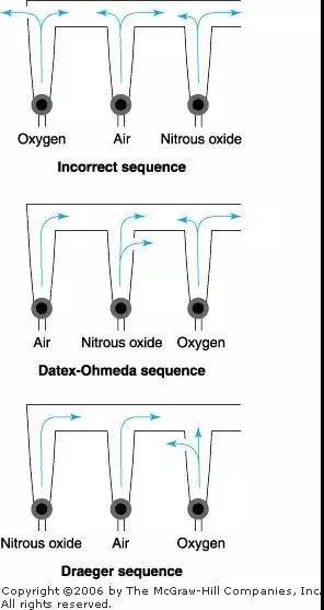 另外,不知道大家有沒有觀察過流量計的順序問題,其實這也有講究。也就是把氧流量計安裝在最靠近共同出口處,萬一在氧上風位發(fā)生的漏口,這樣流失的大部分是N?O或者空氣,O?損失最少。當然,它的順序也不能保證不發(fā)生因流量計破裂所致的低氧。