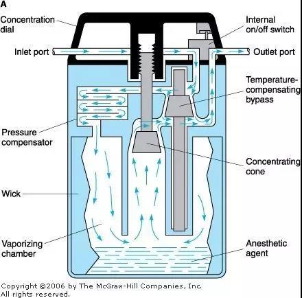 麻醉藥物經(jīng)揮發(fā)罐生成麻醉蒸氣,并控制所需定量的麻醉蒸氣進入呼吸回路,隨混合氣體一起送給患者。