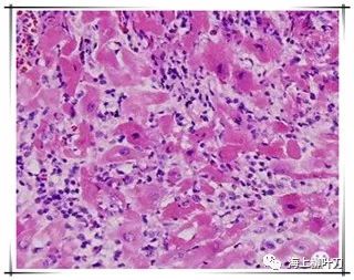 7.100倍還不是看得很清楚,放大400倍就很明顯了,一個個藍(lán)點就是淋巴球。這是很厲害的猛暴性心肌炎,整個心臟都被淋巴球浸潤了。