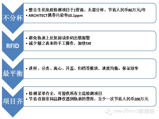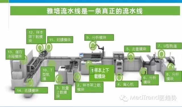 縱觀IVD國際品牌的發(fā)展歷程,都是從低速生化朝高速生化發(fā)展,由單機朝向集成化、自動化、流水線的方向發(fā)展。由于中國病人的過度集中于大型三級醫(yī)院,年收入超過10億的醫(yī)院每天樣本量超過1000個,高速儀器是高端醫(yī)院的剛需,因此研發(fā)高速儀器的能力也是未來進入大型公立醫(yī)院的前提要求,流水線、生化免疫聯(lián)機是大勢所趨。