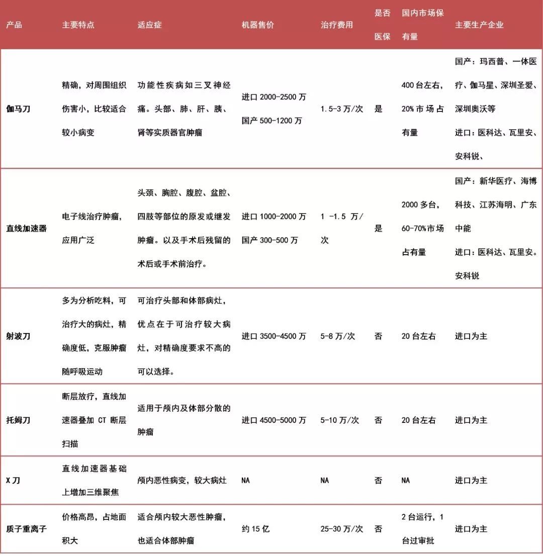目前的放射治療技術(shù)包括伽瑪?shù)丁⑸洳ǖ?、托姆刀、質(zhì)子重離子、EDGE(速鋒刀)無創(chuàng)手術(shù)系統(tǒng)。各技術(shù)的特點如下。